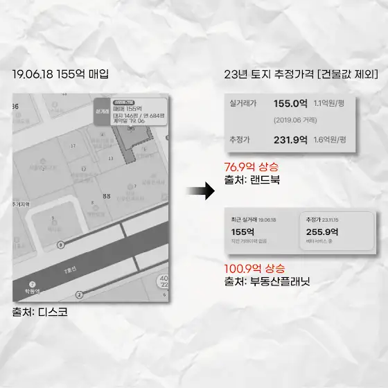 -여러분들은 ‘돈’을 떠나서 일을 할 때큰 ‘보람’을 느꼈던 적은 언제인가요?업종 특성상 저마다 보람을느낄 때가 있다고 생각합니다.위에 건물은 제가 직원일 때팀장 진급을 위한 마지막 계약이었습니다. 제가 23살 때 제 손님 강남 건물 매각을 도와드렸고,1년 후 위에 강남 건물을 매입까지 도와드렸습니다.2019.06.18에 155억에 계약을 하셨고,제일 중요한 지가 상승은 약 4년이 지난현재 토지 추정가격은 [건물 가격 제외]랜드북 - 231.9억 [76.9억 상승]부동산플래닛 – 255.9억 [100.9억 상승]건물값을 추가 산정하면,더 높은 금액이 측정되었을 겁니다. 당시 강남임에도 높은 수익률이 나오고 있었습니다.현재는 물가 상승률로 인하여,임대료 수익도 크게 증가하였습니다.당시 최연소 팀장 진급 계약이라위 건물의 계약을 잊지 못하고,24살 어린 저를 믿고 100억 대 건물을매입해 주신 매수자분께 정말 감사드립니다.위에 건물 매매 사례는타 부동산중개법인에서 성공사례로 많이 다뤘습니다.손님의 부동산 지가 상승이 많이 된 걸 보면너무 뿌듯하고, 큰 보람을 느낍니다.#부동산 #공인중개사