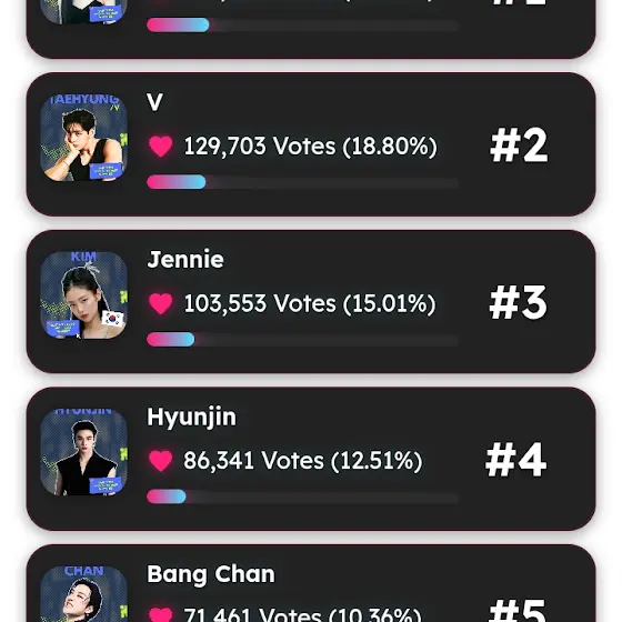 Jhope 6th আমাদের 1st এ আনতে হবে ,, and ভি ke ও 1st position এ আনতে হবে তাই বেশি করে ভোট দেও bts কে