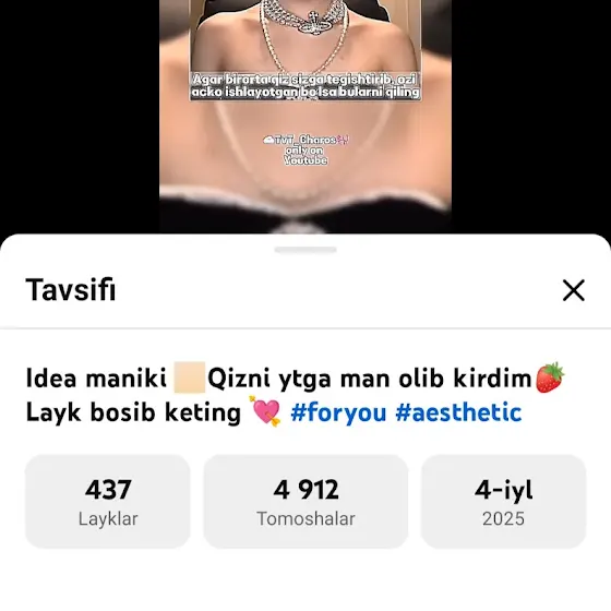 @My_sara.1 Qizni ytga kim olib kirgan ekan?👀 Man bu qizni 4-iyul kuni ob kirganman va yana shu qizni qatnashtirib vid qoʻydim. Siz videoni esa 8-oktyabrda qoʻygansiz. Atm qib qoʻyish esizdan chiqmasin bu qizni judayam yaxshi koʻramanda💕 Yaxshi yomon bop boʻlmaylik dedimda😁✨