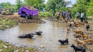 Complete100% New Project In The Flooded Village Area Overloading Dirt by Dump with Mini Dozer Pushin