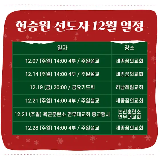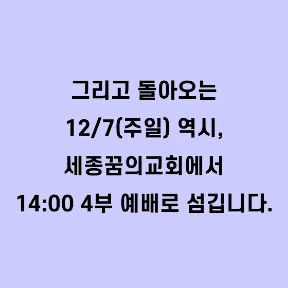 돌아오는 12월 7일(주일) 14시 세종꿈의교회 4부 예배에서 섬깁니다.