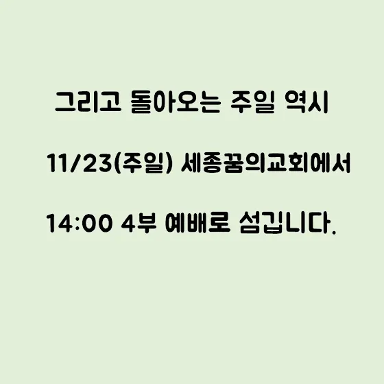 돌아오는 11월 23일(주일) 14시 세종꿈의교회 4부예배에서 섬깁니다.