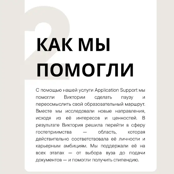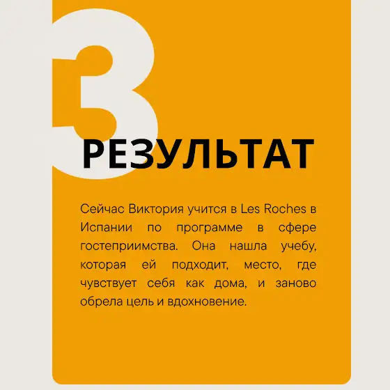 Виктория — яркий пример: с нашей поддержкой она нашла свой новый путь, подала сильную заявку и получила стипендию.
