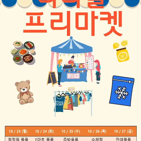 요일 별 다양한 물품을 판매할 예정이오니 찾아와 주셔서 많은 구매 부탁드립니다. :)