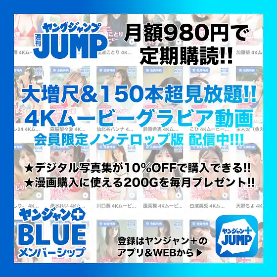 月額980円の週刊ヤングジャンプ定期購読! ・毎月マンガに使える200Gプレゼント特典! ・高画質版の号読み&気軽な話読み、どちらも対応! ・150本超見放題!大増尺&字幕無し4Kグラビア動画特典 ・会員限定アザーカット特典! ・デジ限定写真集がサイト購入で10%OFF特典! yjump.jp/3MKSozw ▲ヤンジャン+BLUEメンバーシップで最新号を読む ★限定アザーカット付き! デジタル写真集の購入はヤンジャン+グラビアサイトで! ynjn.jp/gravure 週刊ヤングジャンプ50号 木曜日発売! ynjn.jp/gravure/issues/402 ※デジタル版は3か月の期間限定配信です。 ★チャンネル登録お願いします!★ www.youtube.com/channel/UCU_f... ★ヤングジャンプ公式アカウント・サイトはコチラ! ■ヤンジャン+グラビアサイトでデジタル写真集販売中! ynjn.jp/gravure ■ヤングジャンプ@グラビアX twitter.com/g_youngjump ■ヤングジャンプ@グラビアInstagram www.instagram.com/gr_youngjump_official/ ■週刊ヤングジャンプ公式サイト youngjump.jp/ ■ヤングジャンプ編集部公式TikTok www.tiktok.com/@youngjump ■ヤングジャンプ編集部公式X twitter.com/young_jump ■集英社青年マンガアプリ・サイト「ヤンジャン+」 ynjn.jp/ ■となりのヤングジャンプ tonarinoyj.jp/ ※デジタル版ヤングジャンプは、紙版の同号より未掲載のコンテンツがございます。試し読みファイルのデジタル版目次や注意書きをご確認の上ご購入ください。/「ヤングジャンプ 2025 No.50」、紙と同時に配信!/【表紙&巻頭グラビア】藤崎ゆみあ(※「崎」は「たつさき」が正式表記)/【特別付録】『こばしり。』8P小冊子/【巻頭カラー】『メルヘンクラウン』(赤坂アカ×あおいくじら×アジチカ)/【カラー扉付き】『ガス灯野良犬探偵団』(原作:青崎有吾 漫画:松原利光)、『おさななななじみ』(雪森寧々)/【特別読切&「ウルトラジャンプ」出張掲載】『バグエゴ』(原作:ONE 作画:設楽清人)/【特別読切】『ドリンクシンキング』(三浦魁人)、『夢追いレンズ』(森三歩)/【センターグラビア】由良ゆら(# よーよーよー)/【巻末グラビア】沢美沙樹/ほか、14作品を掲載!