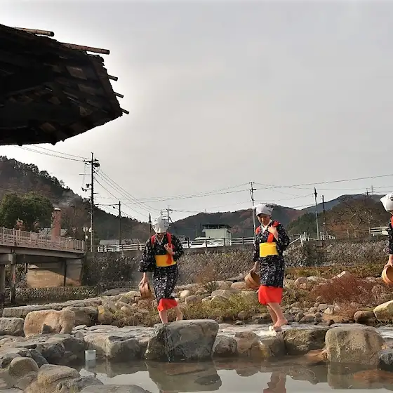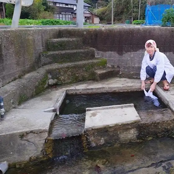 奥津温泉、足ふみ洗濯コスプレです。左右の娘さんは娘位の年齢です。