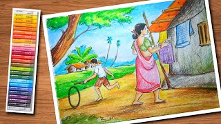 Fishing Scenery Drawing Easy | How to Draw Village Scenery Of Fishing | Oil Pastel Scenery Drawing |