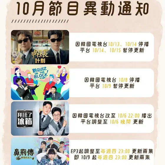 ⚠️追劇追綜的粉絲們請注意⚠️ 因應韓國電視台播出時程調整,以下為 #平台更新時間異動 造成不便敬請見諒,感謝粉絲們一直以來的支持🫶 /// 💙《申社長計劃》10/14、10/15停播 💙《劉QUIZ ON THE BLOCK》10/9停播 💙《拜託了冰箱》原10/5晚間更新,改為10/6晚間更新 💙《鼻荊傳:妖怪的主人》EP3起調整至每週四23:00更新兩集,即10/9起每週四23:00更新兩集