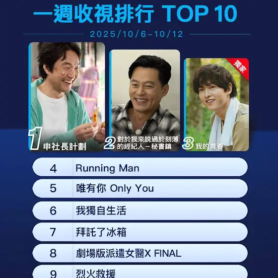 恭喜 #申社長 登頂第一位🏆 本周韓國停播兩集!想看新集數要再等等了 🔍TOP 10立即追 video.friday.tw/ NO.1 《申社長計劃》 NO.2 《對於我來説過於刻薄的經紀人-秘書鎮》 NO.3 獨家《我的青春》