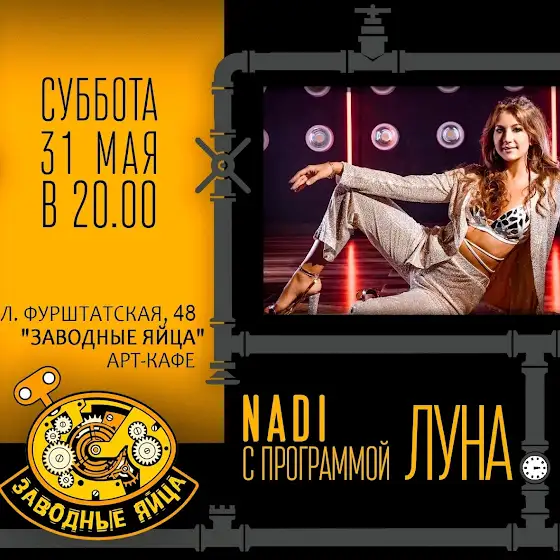 Живой концерт певицы NADI в Санкт-Петербурге 31.05.2025 с 20:00-22:00 в арт-кафе Заводные яйца. Вход свободный. Приходите.