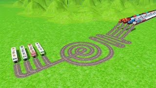 SEVEN REALISTIC AI TRAINS🚂 CROSSING CAREFULLY BY BUMPY CIRCLE TRACKS ZIG ZAG RAILWORK RAILROAD BEANG