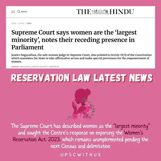 The Supreme Court has called women the “largest minority” and sought the Centre’s response on the delay in implementing the Women’s Reservation Act, 2023 👩⚖️