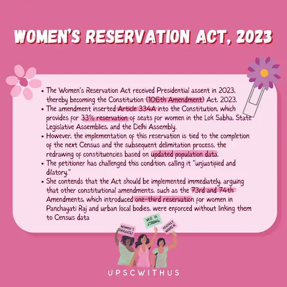 📌 The Act provides 33% reservation for women in the Lok Sabha and State Assemblies, but it remains unimplemented — pending the next Census and delimitation process.