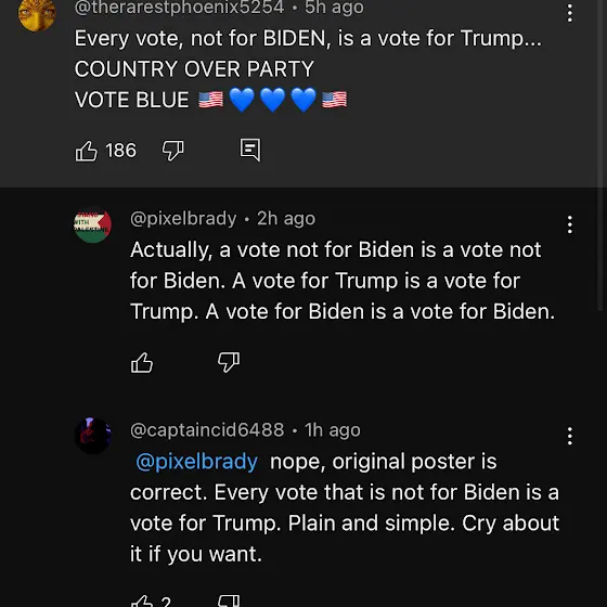 Any vote not for Trump is, by definition, is not helping Trump beat Biden. The Zionist Blue MAGA cult are the reason that we can't have progressives in office. If you were brave enough to stand up to our elected officials and say "I don't approve of your actions" with our vote for anyone not a part of the one-party-system, the democrats would learn that they need to change in order to win. If they don't learn that, they deserve to be voted out of office. Remember in 2020 when we were all horrified at Trump's cult-like following chanting "four more years"? Now it is Biden's cult-like following shouting "four more years" whenever someone dares call out Biden about his actions in Gaza. You are all hypocrites.