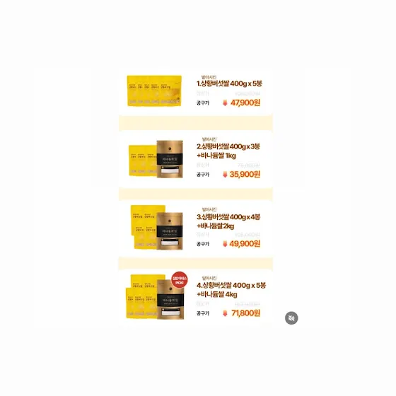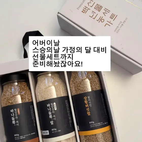 잠시 후 10시백년농가 x 집밥아네스 인생쌀 오픈합니다!link.inpock.co.kr/agneszipbop1. 상황버섯쌀 400g *5봉 47,900원2. 상황버섯쌀 400g *3봉 + 바나듐쌀 1kg 35,900원3. 상황버섯쌀 400g *4봉 + 바나듐쌀 2kg 49,900원4. 상황버섯쌀 400g *5봉 + 바나듐쌀 4kg 71,800원5. 상황버섯쌀 400G *10봉 + 바나듐쌀 4kg + 상황버섯진액 체험팩(3포) 92,900원6. 백년농가 건강세트(바나듐800g 2개 + 상황버섯쌀 800g 1개 35,900원7. 백년농가 백년세트(바나듐800g 1개 + 상황버섯쌀 800g 1개 + 바나듐잡곡 800g 1개) 35,900원🏷️상황버섯쌀 단품 추가옵션 10,900원‼️최대 60,62% 할인‼️🏷️총 7가지 옵션인데 저는 개인적으로 4번 추천해요.🏷️옵션 5번 최다구성 주문하시면 상황버섯 진액 체험팩(3포)가 들어있는데 식전 식후 상관없이 드실 수 있구요. 밥 지을 때 한 포 넣어주셔도 돼요.✔️백프로 현미로 드실 때는15분정도 불리는게 식감이 저한테는 더 좋더라구요!백미와 섞으실 때는 꼭 불리지않아도 된답니다.5월 가정의날 대비선물세트 2종까지 준비해뒀으니 많은 관심 부탁드려요^^