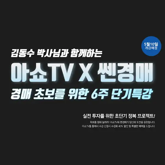 📢 아쇼TV X 쎈경매 김동수 박사님과 함께 5월 10일부터 매주 토요일 6주간 경매 초보자도 쉽게 배우고 실전투자까지 할 수 있는 강의를 시작합니다!