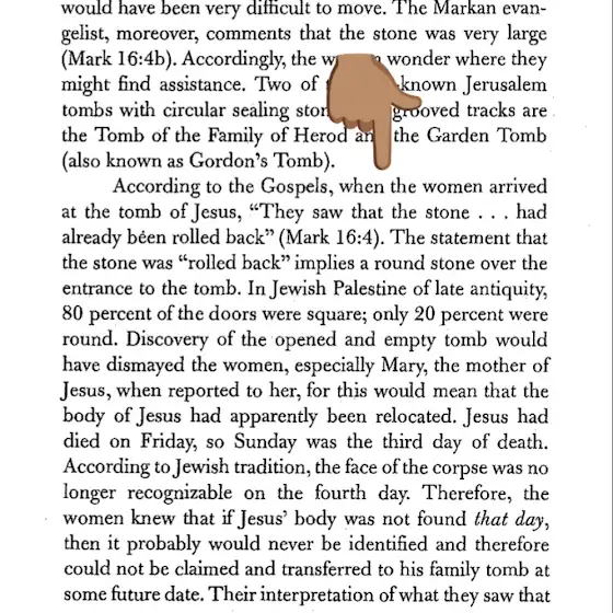 La afirmación de que la piedra fue “removida” implica que se trataba de una piedra redonda colocada sobre la entrada del sepulcro. En la Palestina judía de la antigüedad, el 80 % de las puertas eran cuadradas y solo el 20 % redondas.