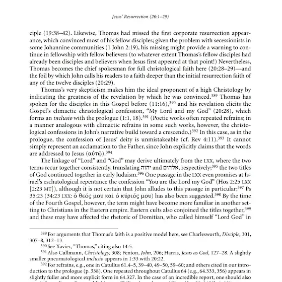 Un pasaje de la LXX incluso promete, en el arrepentimiento escatológico de Israel, la confesión: “Tú eres el Señor, mi Dios” (Ose 2:25 LXX [2:23 MT]); también se ha sugerido Sal 35:23 (34:23 LXX: “mi Dios y mi Señor”). Para el tiempo en que se compuso el Cuarto Evangelio, sin embargo, la expresión podría haberse vuelto más familiar en otro contexto para los cristianos del oriente del imperio. En los cultos orientales también se unían estos títulos, y esto pudo haber influido en la retórica de Domiciano, quien se llamaba a sí mismo “Señor Dios” en edictos imperiales y esperaba ser llamado “Señor Dios” (Suetonio, Dom. 13).