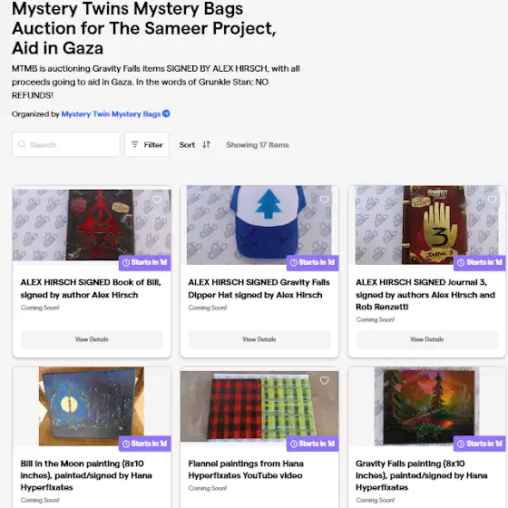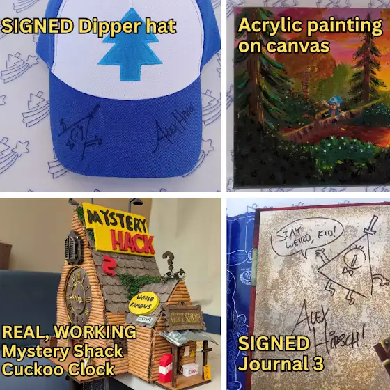 Hey all! The charity project I've been running raised $35,000 in aid for Gaza, but we're still going! Mystery Twin Mystery Bags is hosting an auction of GF merch signed by series creator Alex Hirsch!