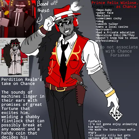 Y'know what? FUCK THIS SHIT, Two time, Chance, and Taph are MY characters. They're mine and I'm redesigning them. They don't deserve to be associated with a horrible rat that's dragging the whole damn game down with it. Don't even associate Perdition Realm with forsaken anymore. This isn't exactly quitting but I'm stepping away from the community and it's game. I'm still gonna make forsaken content but I'd hate to even touch the game nor its community. Forsaken Devs proved again and again they're liars, they didn't keep their promise. I don't care about the direction Forsaken is going for anymore.