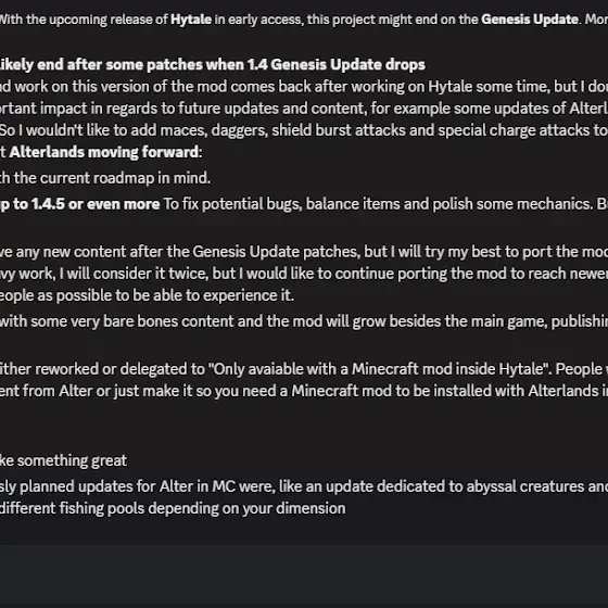Hace unos minutos redacté un comunicado en mi grupo de Discord dedicado a Alterlands en Minecraft, y me gustaría hablar de eso por acá ya que ustedes serán probablemente el nuevo público de mi mod para cuando salga Hytale Early Access.