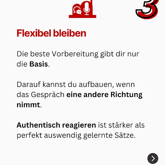 Das gilt auch für wichtige Gespräche. Du kannst dich perfekt vorbereiten, aber im entscheidenden Moment zählt deine Fähigkeit zu reagieren.