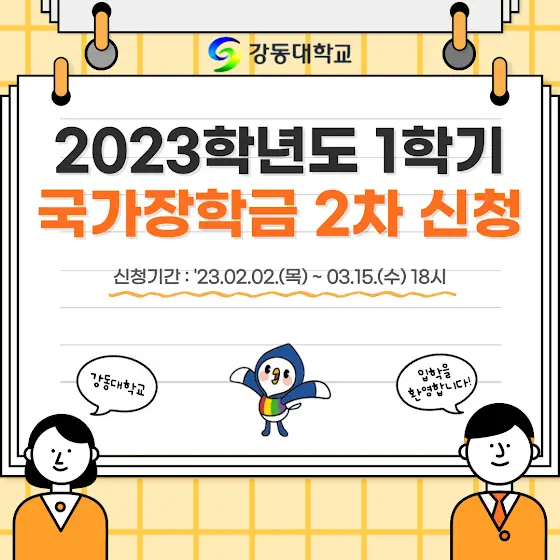 2023학년도 1학기 국가장학금 2차 신청 안내드립니다! 국가장학금 1차 신청을 못한 학생분들은 일정을 참고하여 국가장학금 신청을 진행해주세요🤞