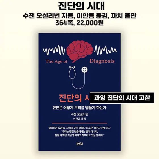 📚첫 번째 책은 〈진단의 시대〉입니다. 수잰 오설리번 지음 이한음 옮김 까치 출판입니다. 364쪽 22,000원입니다. 과잉진단의 시대를 직시하게 하는 책이라고 합니다. 진단이 과도하게 확대되어 정상과 비정상의 경계가 협소해지는 현실을 짚는대요. 주제에 동의하기도, 반대하기도 하는데요. 책을 꼭 한 번 읽어보고 싶어지네요.