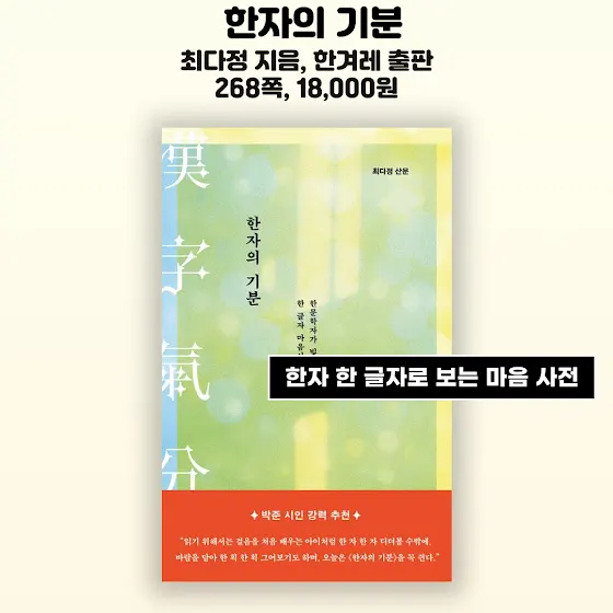 📚세 번째 책은 『한자의 기분』입니다. 최다정 지음 한겨레 출판입니다. 268쪽 18,000원입니다. 한자 한 글자씩을 통해 마음사전을 만들었다고 합니다. 얼룩을 닦는 기분, 집에 온 기분, 읽는 기분 같이 꼭 읽어보고 싶은 감정들이 있네요. 눈길이 가는 책입니다.