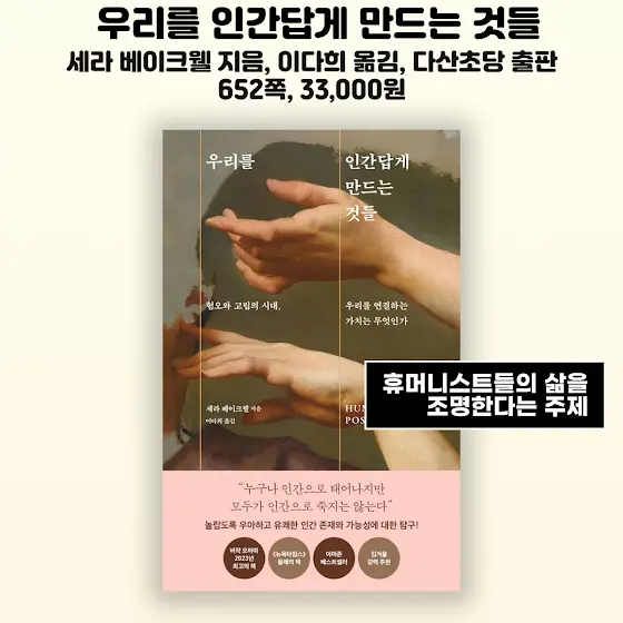 📚첫 번째 책은 『우리를 인간답게 만드는 것들』입니다 세라 베이크웰 지음 이다희 옮김 다산초당 출판입니다 652쪽 33,000원입니다 르네상스부터 현대까지의 사유를 가로지르며 휴머니스트들의 삶을 압축해 보여준다고 합니다. 휴머니즘을 지식이나 이념이 아닌 태도로 재정의한다는 말이 책에 관심을 갖게 합니다.