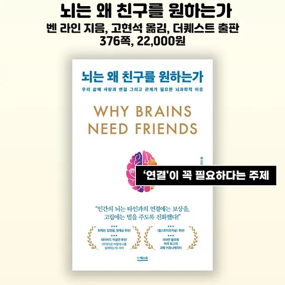 📚다섯 번째 책은 『뇌는 왜 친구를 원하는가』입니다 벤 라인 지음 고현석 옮김 더퀘스트 출판입니다 376쪽 22,000원입니다 고립은 뇌가 느끼는 가장 가혹한 고통이래요. 사람의 곁에는 왜 사람이 있어야하는지 뇌과학적으로 알아보는 책이라고 합니다. 연결이 우리에게 꼭 필요하다는 주제가 이 책에 눈길을 가게 합니다.