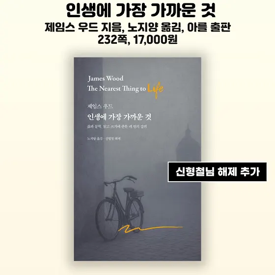 📚두 번째 책은 『인생에 가장 가까운 것』입니다 제임스 우드 지음 노지양 옮김 아를 출판입니다. 232쪽 17,000원입니다 신형철님 해제가 붙었다고 합니다. 읽어볼 수 밖에 없네요. 저자의 회고록이면서 동시에 문학 비평 에세이라는데, 문학을 통한 환대를 이야기한다고 합니다. 그래도 이번 책은 좀 어려울 걸 각오하고 읽어봐야겠네요.