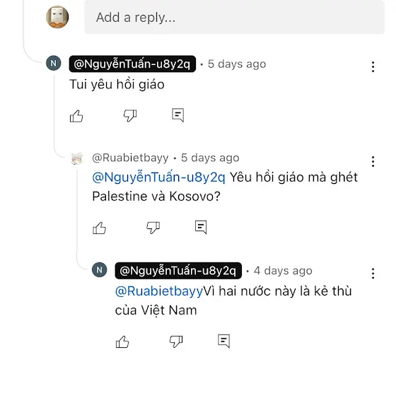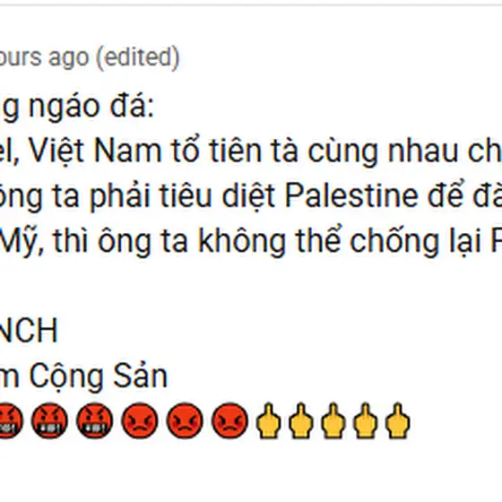 Thì chuyện là có thằng với cái tên là Nguyễn Tuấn ( @NguyễnTuấn-u8y2q ) và thằng này MẤT NÃO vãi cả Sh!t. Ai? Ai nói CHXHCNVN là CALI?! YÊU NƯỚC mà DỐT SỬ QUÁ!!! Các bạn có biết CHXHCNVN là tên viết tắt cho Cộng Hòa Xã Hội Chủ Nghĩa Việt Nam, tức là tên đầy đủ của Việt Nam không? Thật sự là ĐÉLL có sự tồn tại của VNCS! Nếu có thì là Đảng Cộng Sản Việt Nam, là đảng cầm quyền của Việt Nam! Chứ ĐÉLL có chuyện có một quốc gia tên Việt Nam Cộng Sản hay VNCS! Thật sự là có mua mấy cái quyển Kinh Phật, Kinh Qu'ran hay cả Kinh Thánh cũng không thể làm thằng này trong sạch cả! Và cái gì mà "ủng hộ Israel và Palestine"? KẾT THÚC TỪ 13/10 RỒI! Báo Lao Động đã đưa tin về việc này rồi! Chiến tranh Gaza kết thúc! NÓI CHUNG THẰNG NÀY THÌ KHÔNG CÓ THUỐC CHỮA!!! Thôi tui đi chuyển nhóm đến "Cộng đồng dân vẽ, animation" chứ BẤT ỔN QUÁ