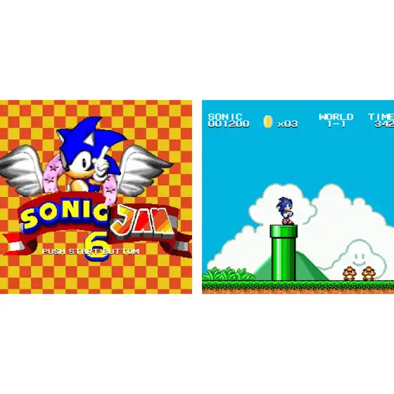 Somari, an infamous bootleg that transforms the original Sonic 1 into a NES port featuring Mario instead of Sonic. This game is widely criticized for its awful gameplay and level design. In contrast, Sonic Jam 6 presents the inverse of this game. This bootleg replaces Mario with Sonic (recolored to red if the player hasn't collected a Super Mushroom) in Super Mario Bros., specifically its Super Mario All-Stars iteration. This game suffers from broken physics and slippery controls, earning it significant criticism.
