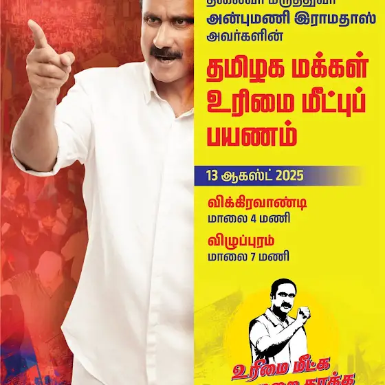 இன்று 13 ஆகஸ்ட் 2025 பாட்டாளி மக்கள் கட்சித் தலைவர் மருத்துவர் அன்புமணி இராமதாஸ் அவர்களின் தமிழக மக்கள் உரிமை மீட்பு பயண திட்டம் 👇🏻