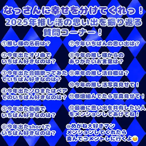 @めがね大好きマン やります‼️①赤組さん②夏☆らびゅ☆大作戦③イケナイ太陽④告白カレンダー⑤コラボ相手様のチャンネルでいいなら名探偵りうら後のラメリィさんのチャンネルであがったやつ‼️⑥ぜったいてきしんじゃ!初ダンスshort⑦FCイベ⑧あそっか マリオパーティは伸ばさないのか⑨推しと話したい‼️‼️👈👈⑩これです‼️おそろっち😸😸⑪赤組さん真ん中バースデーのときのやつ‼️⑫@めがね大好きマン