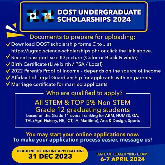 Qualified to apply are 𝐀𝐋𝐋 𝐒𝐓𝐄𝐌 𝐆𝐫𝐚𝐝𝐞 𝟏𝟐 𝐬𝐭𝐮𝐝𝐞𝐧𝐭𝐬 𝐚𝐧𝐝 𝐭𝐡𝐞 𝐓𝐎𝐏 𝟓% 𝐨𝐟 𝐍𝐎𝐍-𝐒𝐓𝐄𝐌 𝐆𝐫𝐚𝐝𝐞 𝟏𝟐 𝐬𝐭𝐮𝐝𝐞𝐧𝐭𝐬 (based on the Gr. 11 overall ranking for all students from ABM, HUMSS, GA, TVL, Arts & Design, and Sports).