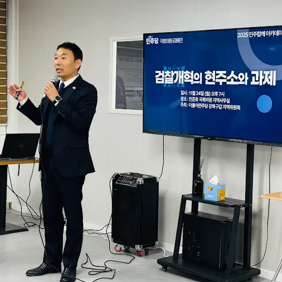 [김용민 의원실]오늘(24일), 더불어민주당 강북구갑 지역위원회가 주최하고 국회의원 천준호 지역사무실에서 열린 ‘민주함께 아카데미 2기’에서 <검찰개혁의 현주소와 과제>라는 주제로 강연을 진행하고 왔습니다. 강연에서는 12.3 불법 비상계엄 시도가 결코 우연이 아니라, 보수 정치세력·법조 카르텔·보수 언론 등 기득권 세력이 맞물린 예정된 수순이었다는 점을 말씀드렸습니다. 또한 기득권 카르텔을 타파하기 위해 필요한 검찰·사법개혁 과제도 함께 설명드렸습니다. 특히 사법 내란을 진압하기 위한 구체적 방안으로 내란특별법 제정, 법 왜곡죄 도입, 공수처법 개정 등의 필요성을 강조했습니다. 강연 내내 강북구갑 당원 여러분께서 보여주신 높은 집중도와 활발한 질의응답 참여 덕분에, 내란 종식과 정의 회복을 반드시 이루어내야 한다는 더 큰 책임감을 느끼게 되었습니다. 앞으로도 국민의 목소리에 귀 기울이며, 내란범들이 온전히 처벌받고 정의가 바로 서도록 최선을 다하겠습니다. 강연에 참석해주시고 깊이 있는 질문과 의견을 나눠주신 강북구갑 당원 여러분께 진심으로 감사드립니다.