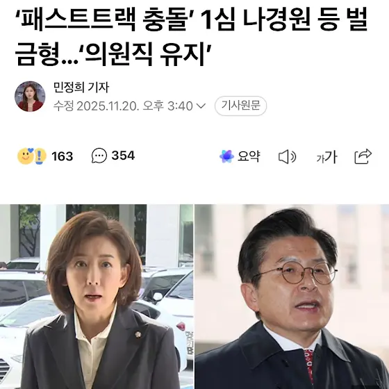 [김용민 의원실]<나경원 패스트트랙 무력충돌 국회법 위반사건은 징역형이 선고되었어야 합니다!>국회의원이라는 지위를 앞세워 절차적 민주주의를 훼손한 행위에는 마땅히 징역형이 선고되어야 합니다. 민주주의는 관용으로 유지되는 것이 아니라 책임 있는 처벌을 통해 지켜지는 것입니다. 그런 점에서 오늘 내려진 ‘국회 패스트트랙 충돌’ 1심 판결은 민주주의 원칙을 확고히 하기에는 현저히 부족합니다.당시 국민의힘 나경원 의원 등은 법안 제출을 저지하기 위해 국회 의안과를 점거하고 회의 진행을 조직적으로 방해했습니다. 이는 단순한 절차 위반이 아니라 국회의 기능을 마비시키고 헌법기관을 무력화한 중대한 사안입니다. 그럼에도 벌금형에 그친 이번 판결은 국회 내 폭력과 무질서를 사실상 용인하는 결과로 이어질 수 있습니다.법무부는 반드시 이번 판결에 대해 항소하십시오. 국회를 뒤흔든 폭력과 무질서를 바로잡아야 할 것입니다.