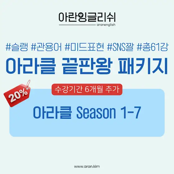 📘 나랑 매일 카톡하며 공부하는 인강원어민과 소통이 술~술 되고미드가 팍~팍~ 들리는살아있는 찐 미국 🇺🇸 영어 회화 수업<아란잉글리쉬 라이브 클래스>"미드가 한국어처럼 들려요""복습도 안 했는데 문장이 술술 나와요""갑자기 영어를 왜 이렇게 잘하냐고 다들 놀라요"간증이 쏟아진, 검증된 수업 ⭐️⭐️⭐️⭐️⭐️..인스타에는 홍보도 하구 후기도 많이 올리는데유튜브에는 소식을 잘 못 들려준 것 같오..👩🏻🏫season 7으로 입문 강추!☑️1년 내내 아무때나 무제한 수강 가능☑️강의 + 교재 + 문제풀이 + mp3 + 상황극☑️+ 1:1 관리 + 1:1 질의응답 + 1:1 발음교정과하게(?) 알차니까 클릭해서 크게 봐!아래 링크에서 자세한 내용 보고 신청하구,문의는 카톡채널 '아란티비'로 보내죠 💙🩵시간 되면 내일 실시간으로 만나아아~~~www.aran.kim/course/course_view.jsp?id=186428&cid=…