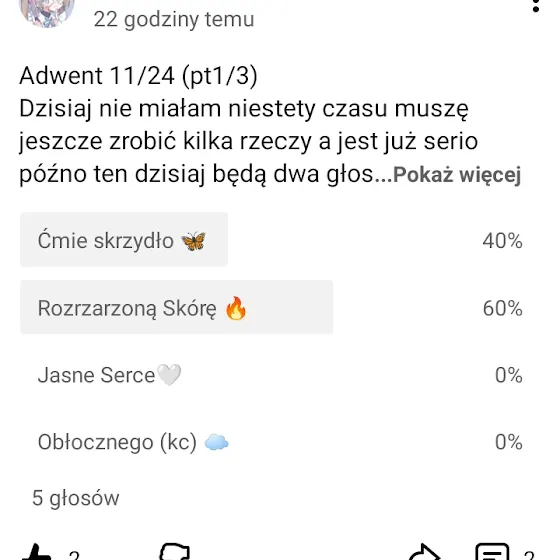 I uwaga w ankiecie wygrała Rozżarzona Skóra i Ćmie skrzydło 2 i 3 arty (ćmie skrzydło mi trochę nie wyszła 🥲)