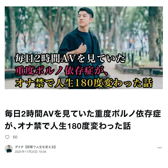 昨日公開したnoteが、「ポルノ依存」「オナ禁」カテゴリーで急上昇1位になりました。