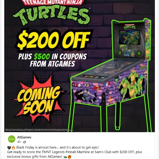 Sam's Deal is live now for $999.00 Teenage Mutant Ninja Turtles AtGames pinball. I love this machine and bought one for myself. Here is the link. www.samsclub.com/ip/legends-pinball-hdp-tmnt/17205… AtGames will be giving AtGames coupons ($500 value) to use on accessories, subscription for customers that purchase TMNT at Sam’s Club during this period of time.