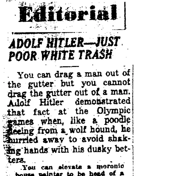 Hitler emphasized that fact when he ducked the finest athletes in the world because they were tinted brown, the color, incidentally, of his uniforms.