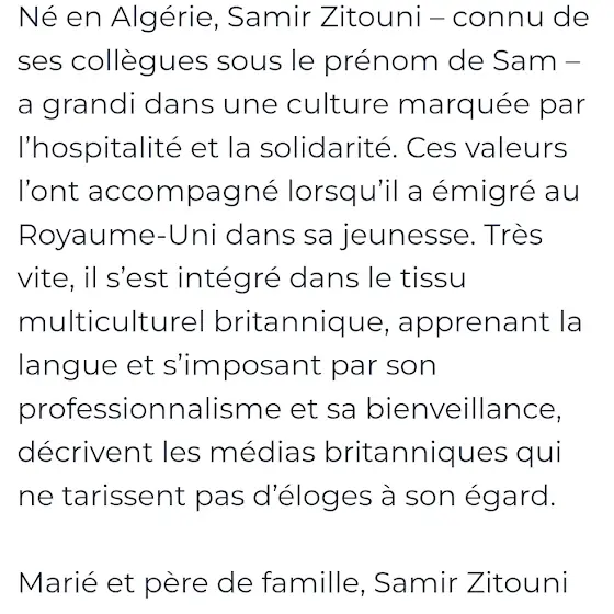 Samir zitouni aka "Sam", algérien de 48 ans, employé de la compagnie ferroviaire London North Eastern Railway (LNER), a risqué sa vie pour sauver celle des passagers d'un train attaqué par 2 assaillants qui poignardaient tout le monde au hasard...