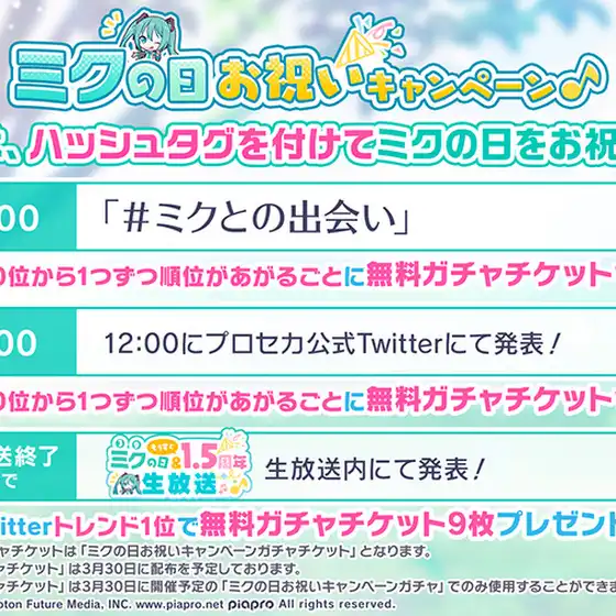 3月9日だぁぁぁぁぁ!ミクの日だぁぁぁぁぁ!ハッシュタグを付けてお祝いするとトレンド順位が上がるごとにガチャチケ1枚最大10枚が配布されるみたいです!キャンペーンを全て達成(?)すると最大【39枚】!ミクだぁ(*´˘`*)♡こういうのを39(ミク)にしてくれる運営好きだ〜(∩´∀`∩)💕無課金勢にとってはありがたい!!!