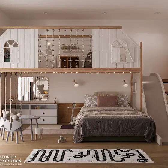soft neutrals, cozy loft playhouse, built-in slide, warm fairy lights, bubble swing chair, study desk and playful details โ a perfect blend of comfort and imagination.