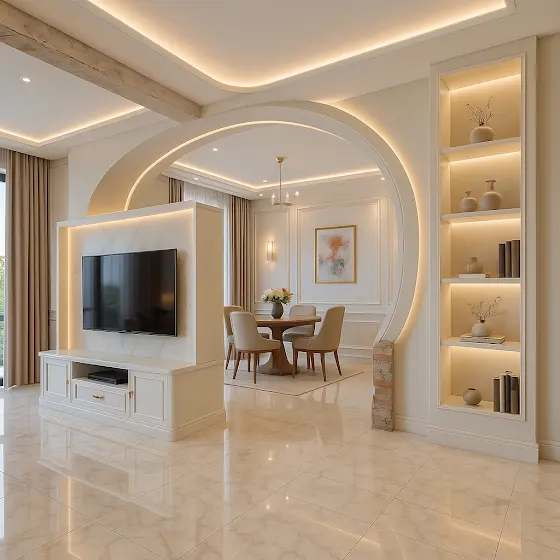 A beautifully designed open living and dining space featuring soft beige tones, natural wood textures, and clean modern lines. Every element was crafted to create a warm, calm, and luxurious atmosphere โ from the custom cabinetry to the elegant lighting and seamless furniture layout.