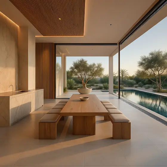 A series of serene, ultra-luxury spaces shaped by warm travertine, sculptural forms, and the seamless dance between indoor calm and outdoor light.