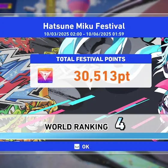 I managed to get 4th on the leaderboards and with it comes to Top 10 Miku Festival title!! I am so happy!